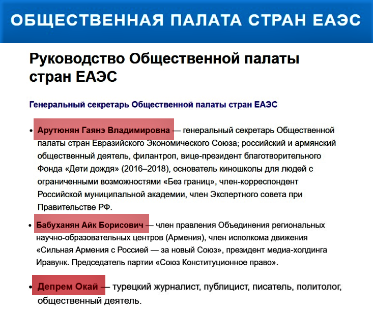 Sonda onu da qeyd edək ki, jurnalist Okay Deprem, “Rusiya ilə Güclü Ermənistan – Yeni Birlik Uğrunda” Hərəkatının İcraiyyə Komitəsinin üzvü, “İravunk” Media Holdinqinin prezidenti, “Konstitusiya Hüququ Birlik Partiyası”nın sədri Ayk Babuxanyan “Yağışın uşaqları” Xeyriyyə Fondunun vitse-prezidenti (2016–2018) olmuş, “Əlillər üçün "Sərhədsiz" kino məktəbi”nin təsisçisi, Rusiya Bələdiyyə Akademiyasının müxbir üzvü Qayane Arutyunyanla birlikdə Avrasiya İqtisadi Təşkilatı yanında İctimai Palatanın üzvləridirlər.