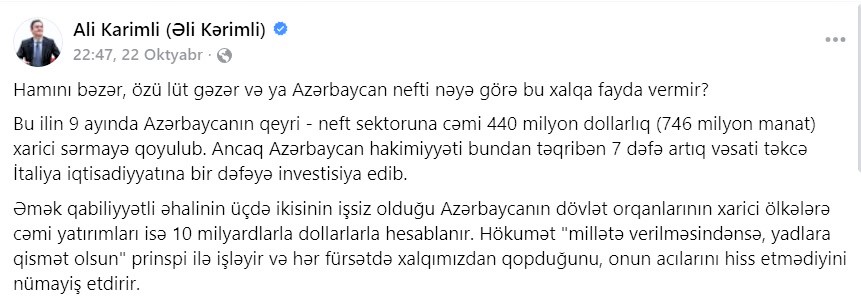 Azərbaycanın xaricə cəmi yatırımları 1,3 milyard olduğu halda Kərimlinin yalnız İtaliyaya yönəlmiş sərmayənin 3.1 milyard olması haqda saxta iddiası bu şəxsin hansısa faktı dəqiqləşdirmədən daim yalanlara sığındığına və qeyri-ciddiliyinə dəlalət edir.