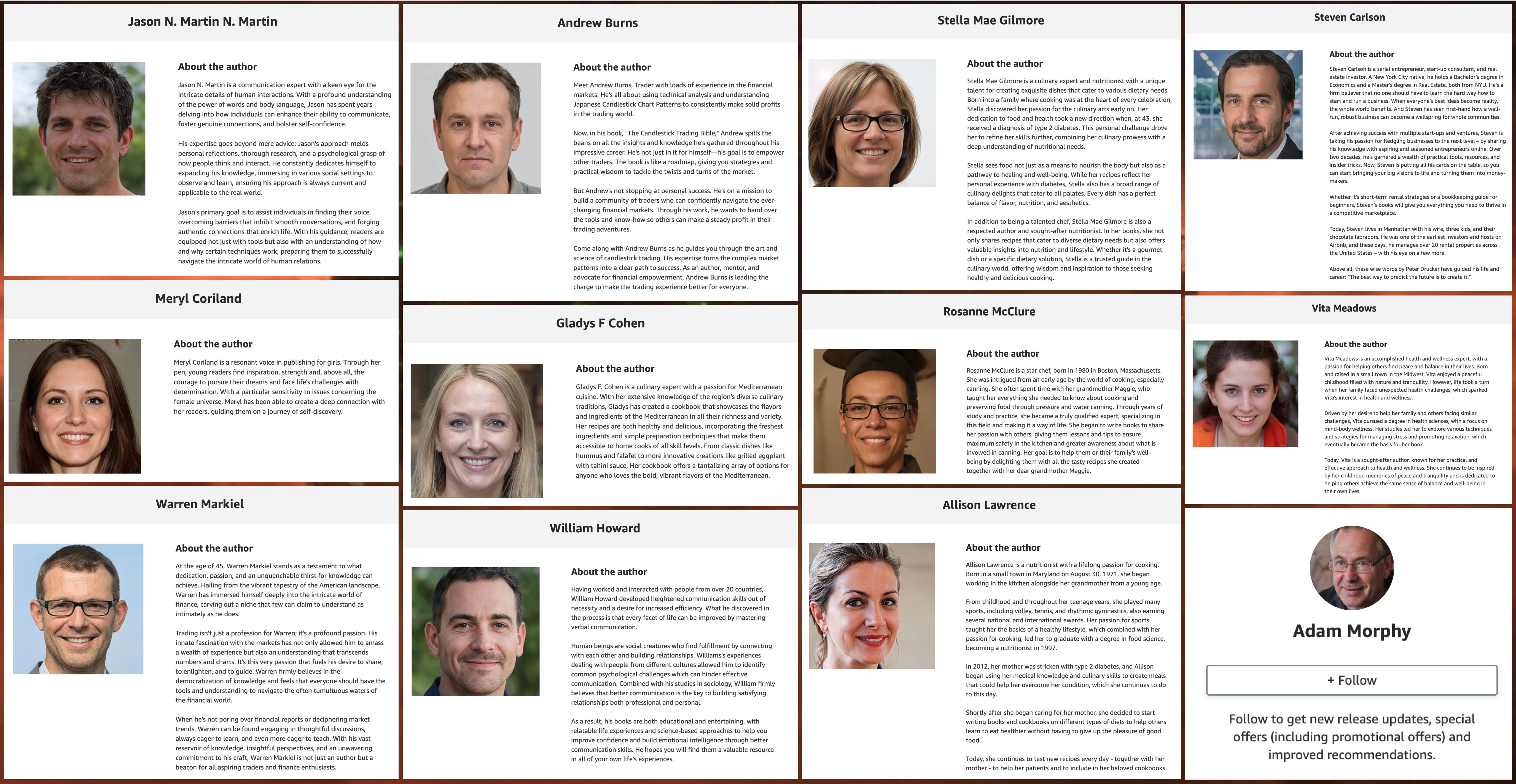In several cases, two different GAN-faced authors seem to have produced mildly different versions of the same book. For example, the title and sample content of “Water Bath Canning and Preserving Cookbook: From the Garden to the Table. 1200 Days of Easy and Affordable Homemade Recipes to Keep Your Pantry Always Stocked” by Allison Lawrence is eerily similar to that of “Water Bath Canning and Preserving Cookbook for Beginners: 1000 Days Quick & Easy Recipes to Water Bath & Pressure Canning. Safely Preserve Meat, Vegetables, Sauces, Low-Sugar Jams, and much more” by Rosanne McClure. Similarly, “THE CANDLESTICK TRADING BIBLE: Ultimate Way to Candlestick Chart Patterns” by Andrew Burns appears to be more or less the same book as “Trade Bible for Candlesticks: The Essential Course: Harnessing the Power of Japanese Candlesticks” by Warren Markiel, and “How to Talk to Anyone: Master Small Talks, Elevate Your Social Skills, Build Genuine Connections (Make Real Friends; Boost Confidence & Charisma)” by Jason N. Martin N. Martin resembles multiple books by William Howard.
