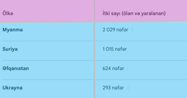 Suriyada itki sayı 1015, Əfqanıstan 624 nəfər olub. Ukraynada bu rəqəm 293 nəfər təşkil edir.