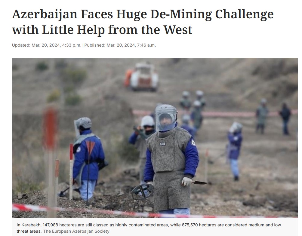 Məqalədə deyilir ki, hazırda Azərbaycanın qarşısında işğal dövründə Ermənistan silahlı qüvvələri tərəfindən quraşdırılmış təxminən 1,5 milyon yerüstü minanın zərərsizləşdirilməsi kimi böyük vəzifə dayanır. BMT-nin İnkişaf Proqramı (BMTİP) tərəfindən edilən kömək istisna olmaqla, Qərb Azərbaycana kiçik dəstək göstərir. 2020-ci ilin noyabr ayında atəşkəs sazişinin imzalanmasından indiyədək Qərb Azərbaycan Minatəmizləmə Agentliyinə (ANAMA) cəmi 12,5 milyon dollar yardım ayırıb. Halbuki minatəmizləməyə təxmin edilən vəsait 25 milyard dollar dəyərində qiymətləndirilir.