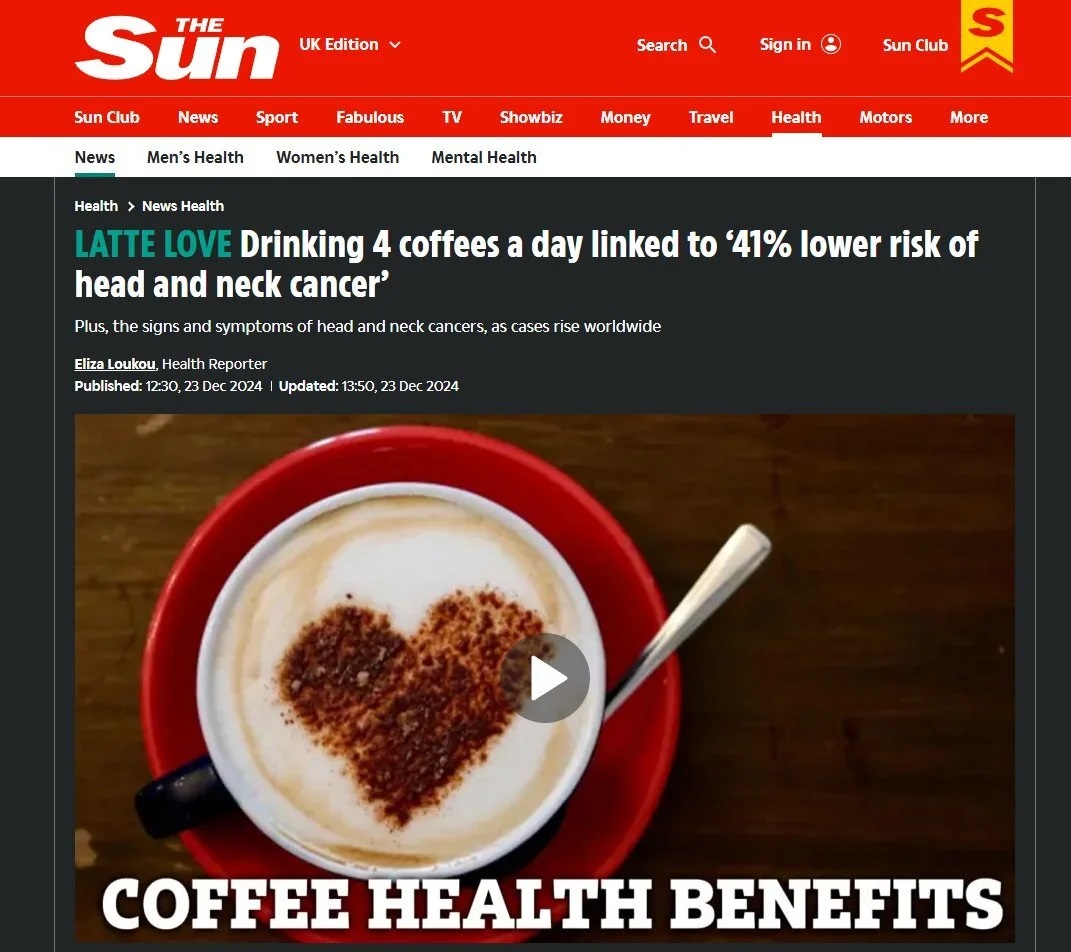 23 декабря 2024 года на сайте британского издания The Sun была опубликована заметка под названием «Употребление 4 чашек кофе в день связано с "снижением риска развития рака головы и шеи на 41%"». Наша команда заинтересовалась этой проблемой и решила проверить информацию.