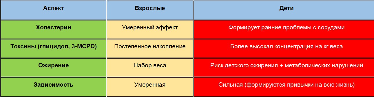 Почему это критично: Детские смеси содержат 25-30% масла, и часто это пальмовое. При переработке в нем образуются токсичные соединения — глицидол и 3-MCPD.
