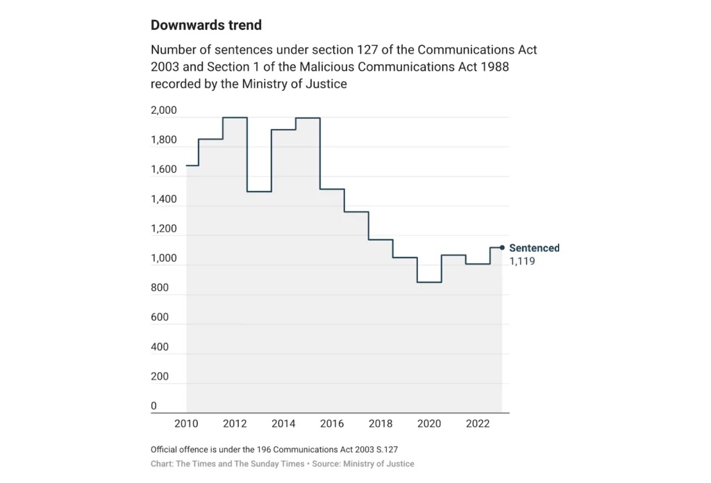 Данные о 12 183 арестах в Великобритании за оскорбительные сообщения в интернете приводила газета The Times весной 2025 года. Журналисты изучили отчёты 37 полицейских департаментов за 2023 год по двум статьям: ст. 127 закона о коммуникациях (Communications Act) и ст. 1 закона о злонамеренных коммуникациях (Malicious Communications Act). Авторы публикации при этом обращают внимание, что это данные не всех департаментов. Восемь из них не ответили на запросы или предоставили неполные сведения (и эти данные были исключены из подсчётов), в том числе полиция Шотландии, второй по величине департамент в Великобритании. То есть общее число арестов, вероятно, выше.