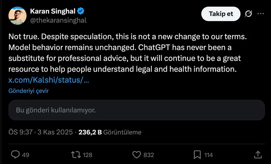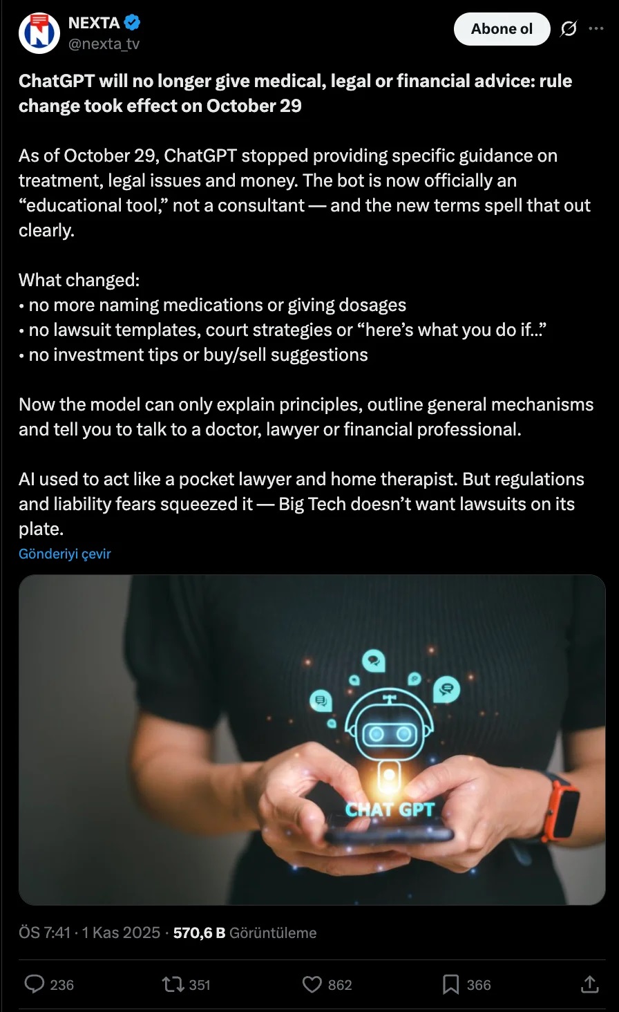 Buna göre platform, 29 Ekim 2025’ten itibaren geçerli olmak üzere politikalarında bazı değişiklikler yapmış. Kaynağın son halinde de hukuki, medikal ve finansal tavsiyeler hakkında bir kısım yer alıyor.