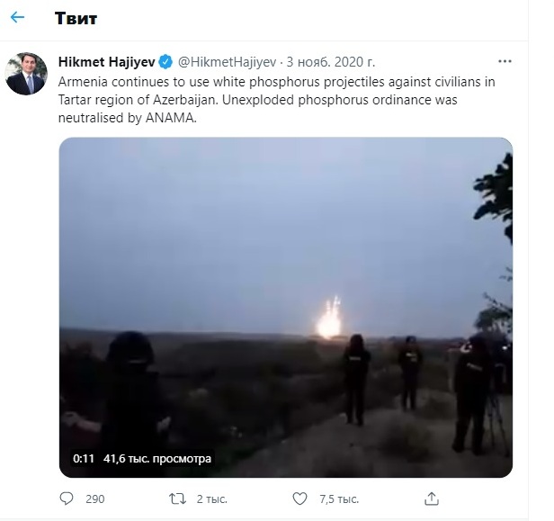 Xatırladaq ki, Ermənistan 44 günlük müharibənin sonunda qadağan olunmuş sursatlaran istifadə ilə bağlı açıqlamalara cavab olaraq Azərbaycanı "Dağlıq Qarabağın dinc əhalisinə qarşı fosfor sursatından istifadə etməkdə" günahlandırıb. Ermənistanın ombudsmanı Arman Tatoyan bu barədə Facebook səhifəsində məlumat yayaraq Azərbaycan ordusunu mülki yaşayış məntəqələrinin yaxınlığındakı meşələrə od vurmaqda ittiham edib.