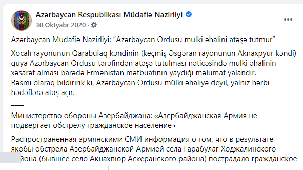 Azərbaycan Müdafiə Nazirliyi ermənilərin yaydığı məlumatın yalan olduğunu açıqlayıb: “Azərbaycan Ordusu mülki əhalini atəşə tutmur. Xocalı rayonunun Qarabulaq kəndinin guya Azərbaycan Ordusu tərəfindən atəşə tutulması nəticəsində mülki əhalinin xəsarət alması barədə Ermənistan mətbuatının yaydığı məlumat yalandır. Rəsmi olaraq bildiririk ki, Azərbaycan Ordusu mülki əhaliyə deyil, yalnız hərbi hədəflərə atəş açır”.