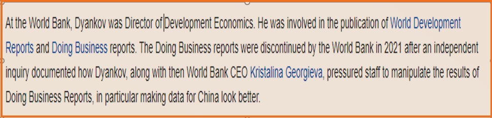 Nəhayət, 4 il əvvəl Dünya Bankı Qrupunun proqramlarına cəlb edilib və “Doing Business” hesabatlarının 2018-2020-ci illər üzrə tədqiqinə rəhbərlik edib. Çox maraqlıdır ki, ondan əvvəlki hesabatlarda hansısa müdaxilələrə və ekspert komandasına süni təzyiqlərə rast gəlinməyib. Dyankova qədər tərtib edilmiş hesabatlarda obyektivlik və ədalətlilik prinsipi əsas meyar olub. Peterson Fonduna bağlı olan Semyon Dyankov Dünya Bankında beynəlxalq əhəmiyyətli bir proqrama rəhbərlik etməsindən sonra iqtisadi təhllillərə siyasi maraqlardan yanaşmalara təsadüf edilib.