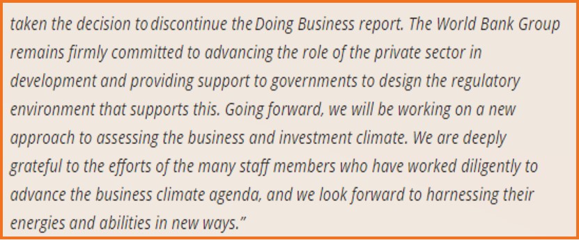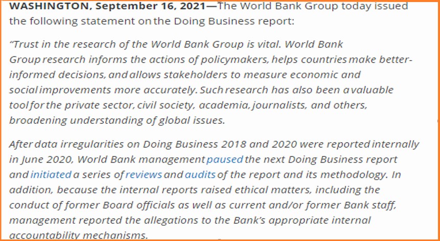 “Məlum olduğu kimi, Dünya Bankı “Doing Business” hesabatlarının nəşrini tamamilə dayandırmağa qərar verib. Səbəb isə hesabatların nəticələrinin saxtalaşdırılmasıdır. Dünyanın aparıcı mətbu orqanları Azərbaycanda aparılan islahatların “Doing Business” hesabatlarında qərəzli şəkildə nəzərə alınmadığından yazır. Məlumatlarının doğru əks olunmadığı bildirilən 4 ölkə (Səudiyyə Ərəbistanı, BƏƏ, Çin və Azərbaycan) arasında yeganə Azərbaycanın göstəricilərinin süni olaraq qurum tərəfindən azaldıldığı, aparılan bir sıra islahatların hesabat üzrə qiymətləndirmələrdə nəzərə alınmadığı məlum olub.