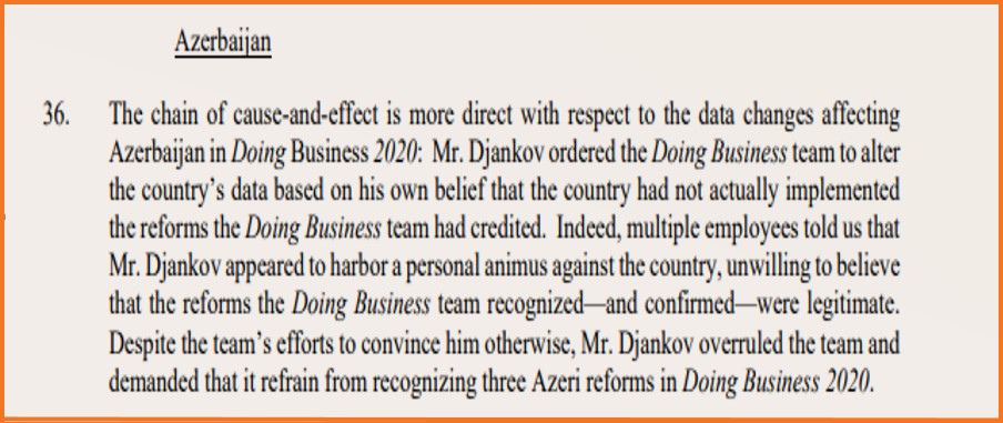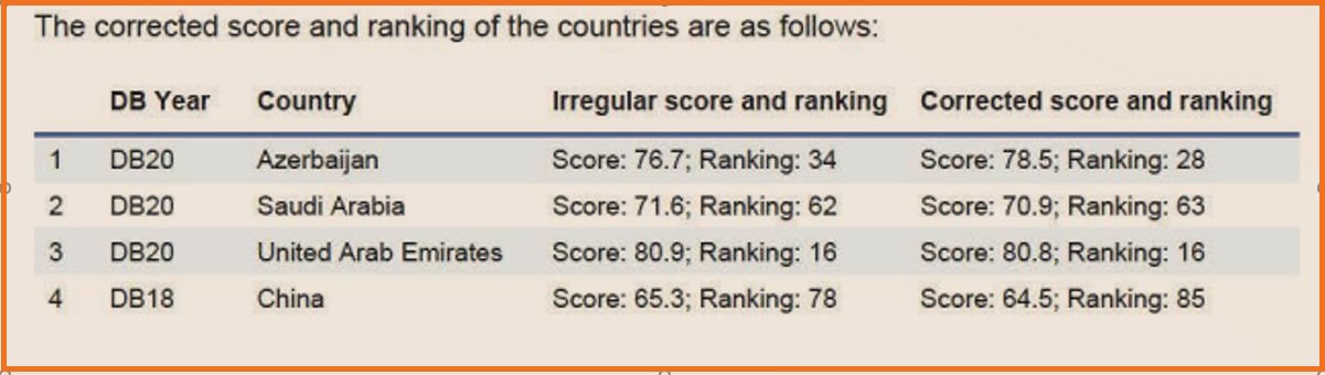 Aparılan araşdırmalar onu göstərir ki, əgər Dünya Bankı tərəfindən 2020-ci il üzrə hesabatda nəticələr saxtalaşdırılmasaydı Çin 7 pillə, Səudiyyə Ərəbistanı 1 pillə geri mövqedə, BƏƏ olduğu mövqedə, Azərbaycan isə 6 pillə daha ön reytinqdə qərarlaşacaqdı”.