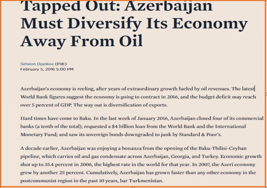 Cənab Dyankov iddia edirdi ki, guya Azərbaycan iqtisadiyyatı çökür və hökumətin maliyyə ehtiyatları tükənib və Azərbaycan vəziyyətdən çıxmaq üçün Dünya Bankı və Beynəlxalq Valyuta Fondundan 4 milyard dollarlıq kreditdən asılıdır. Halbuki, Azərbaycan Mərkəzi Bankının 2016-cı ilə dair pul-kredit bəyanatından da göründüyü kimi Azərbaycanın 37 milyard dollar strateji ehtiyatları var və xaricdən heç bir valyuta alınmasına zərurət yoxdur.