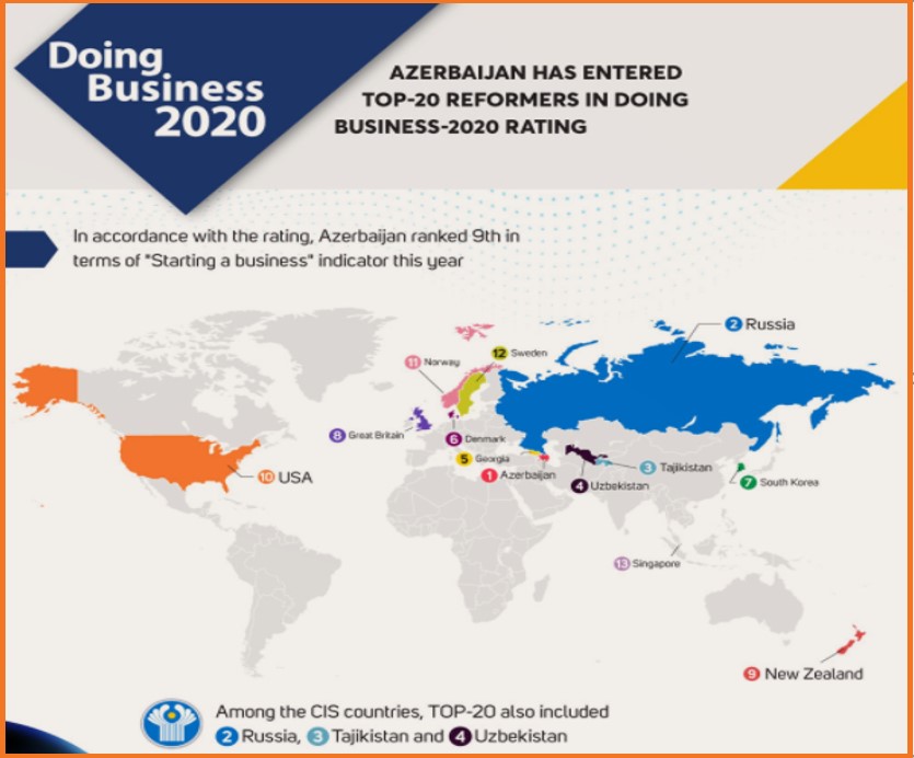 “Doing Business 2020” nəşrində reytinq sıralamamız 6 pillə irəliləyərək 191 ölkə arasında 34-dən 28-ə yüksəldi. Ölkəmiz növbəti dəfə dünyanın “ən islahatçı on ölkəsi” sırasında yer aldı.