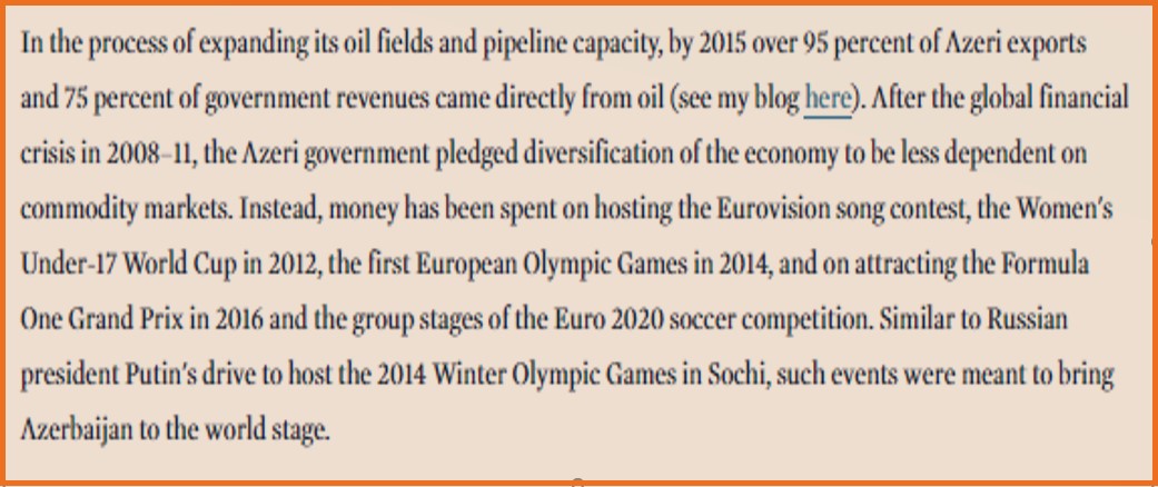 S.Dyankovun sözügedən şərhində iqtisadiyyatdan adlayaraq Azərbaycanın mötəbər beynəlxalq tədbirlərə, o cümlədən, “Avroviziya” mahnı yarışmasına, 17 yaşadək qadınlar arasında Dünya Kubokuna, ilk Avropa Olimpiya Oyunlarına, “Formula-1” Qran Prisinə və digər layihələrə ev sahibliyi etməsinə irad bildirməsinə və hökuməti ittiham etməsi də təəccüb doğuracaq mövzudur.