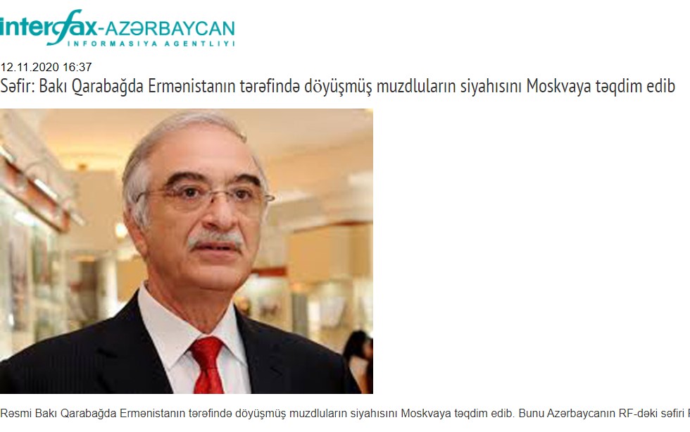 Yeri gəlmişkən, Bakı noyabrın əvvəlində Qarabağda ermənilər tərəfində vuruşmuş muzdluların siyahısını Moskvaya verib. Erməni və rus mənbələrinin əsassız açıqlamalarından fərqli olaraq, Azərbaycan ad və soyadlar və müvafiq terror təşkilatlarının adları daxil olmaqla, müfəssəl məlumat təqdim edib.