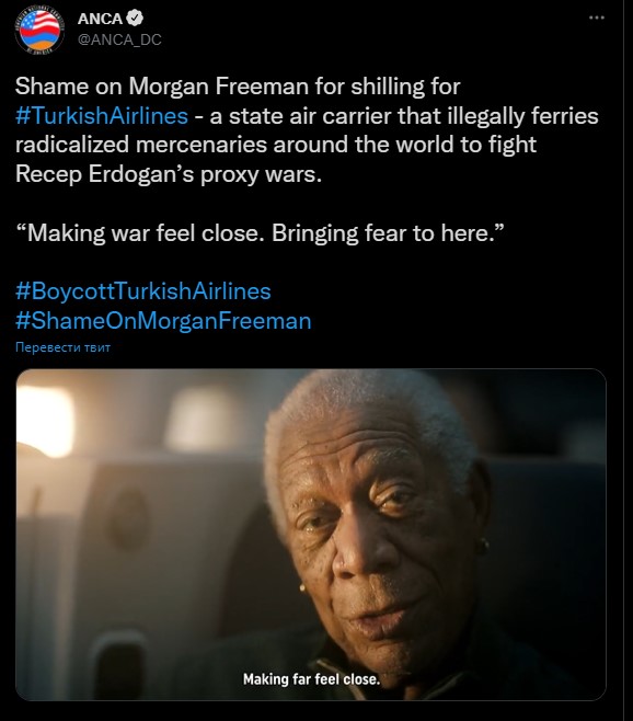 “Rəcəb Tayyib Ərdoğanın radikallaşmış muzdlularını vasitəçilik müharibələri yürütmək üçün qeyri-qanuni yolla bütün dünyaya daşıyan Türk Hava Yolları dövlət aviaşirkətini reklam etdiyinə görə Morqan Frimana ayıb olsun”, – ANCA “Tvitter” hesabında yazıb.