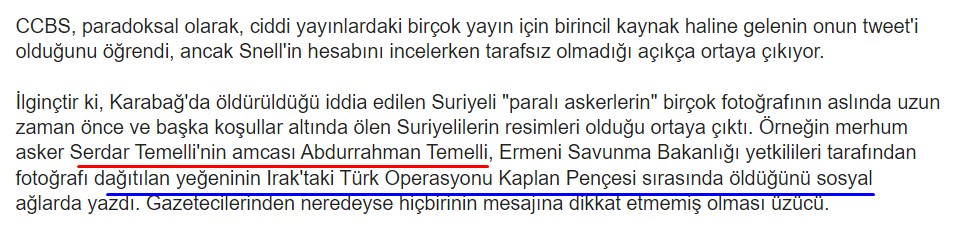 Bolqarıstanda yerləşən “Caspian and Black Sea Analysis Foundation” (CCBS) araşdırma aparıb və müəyyən edib ki, sonrakı saxta yayımçılar üçün əsas mənbə, məhz Snellin tvitləri olub. Yayılan məlumatı heç kim yoxlamayıb. Görünür, onun etibarlılığı kimsəni narahat etməyib də. Belə ki, guya “Azərbaycan uğrunda döyüşmüş” suriyalı muzdluların fotoları dərc edilib. Araşdırma zamanı məlum olub ki, bu şəkillər 44 günlük müharibədən xeyli əvvəl çəkilib və həmin şəxslər Qarabağdan xeyli uzaqda həlak olublar.