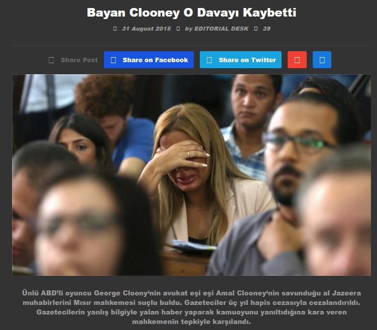 Amal Kluni, həmçinin misirli jurnalistləri müdafiə etdiyi məhkəməni də uduzdu. Onlar terrorçularla əməkdaşlıqda, habelə yalan məlumat yaymaqda və akkreditasiya olmadan işləməkdə ittiham olunublar. “Əl-Cəzirə”nin əməkdaşları vəkillərinin “peşəkar” müdafiəsi sayəsində üç il həbsxanada keçirməli olacaqlar. (Mənbə)
