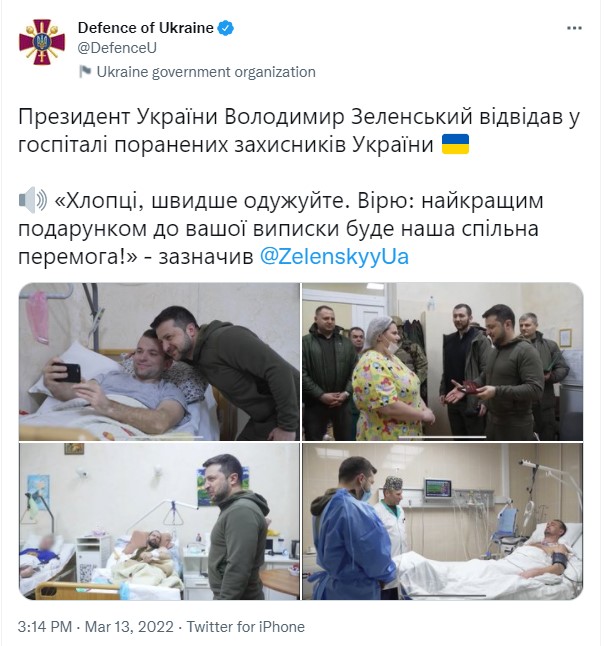 Araşdırmaya ilk olaraq Zelenskinin yaralı əsgərləri ziyarət etdiyi 13 Mart 2022-ci il tarixində çəkilən video və fotolarla başlayaq. Məlumdur ki, bu video-xəbər ilk olaraq Zelenskinin rəsmi hesablarından paylaşılıb. Paylaşılan video və fotolarda prezidentin müalicə alan bir qrup yaralılarla danışdığı və onlara medal verdiyi görüntülənib.