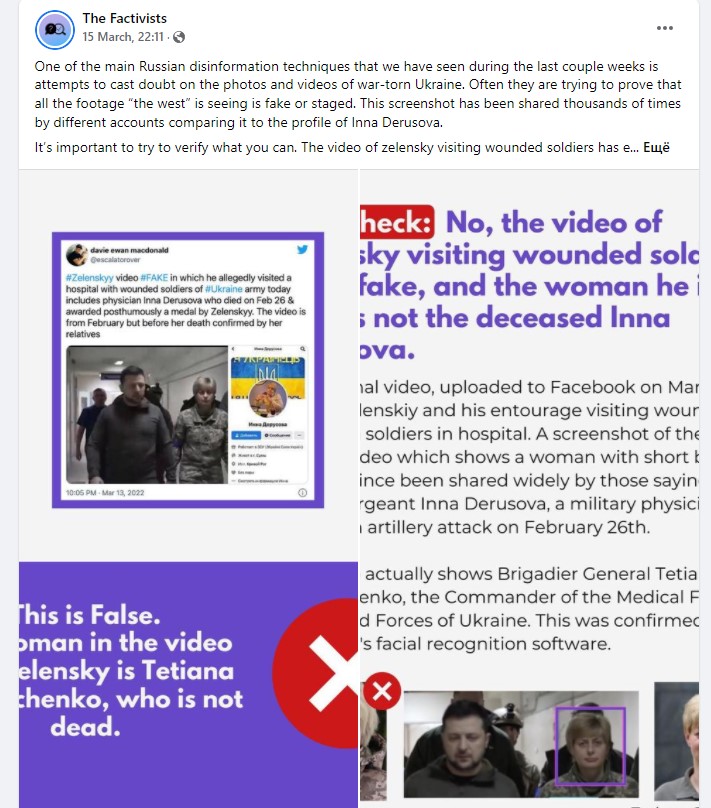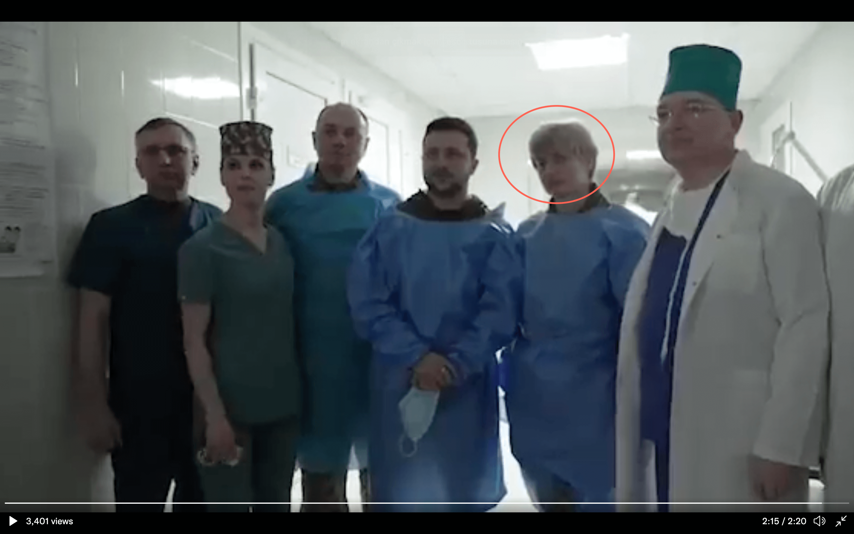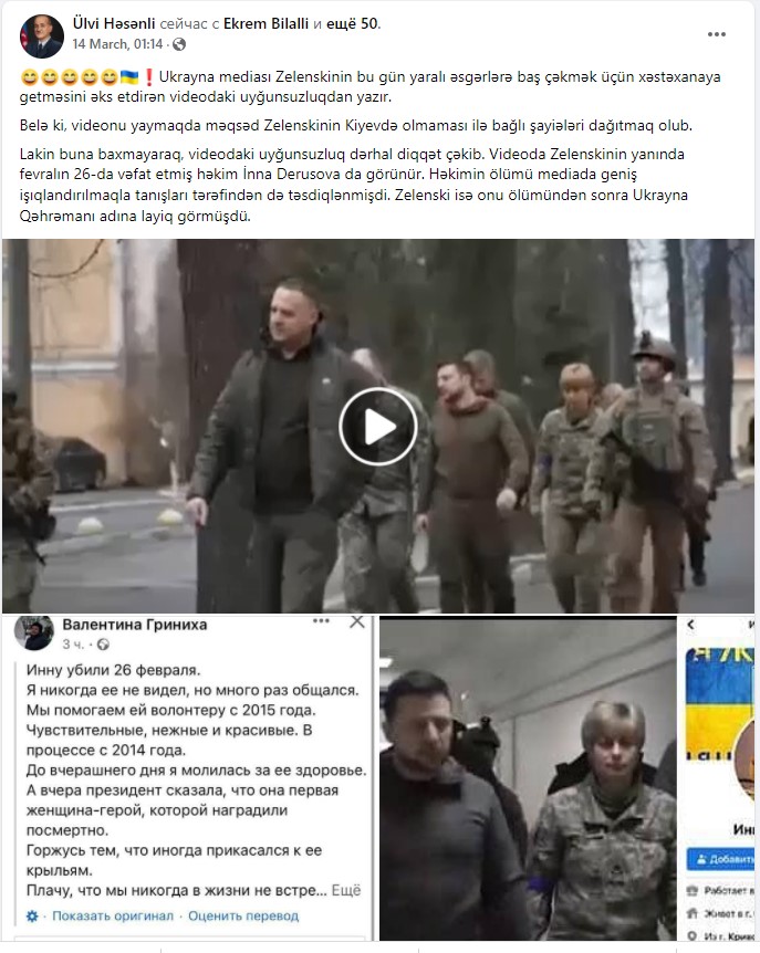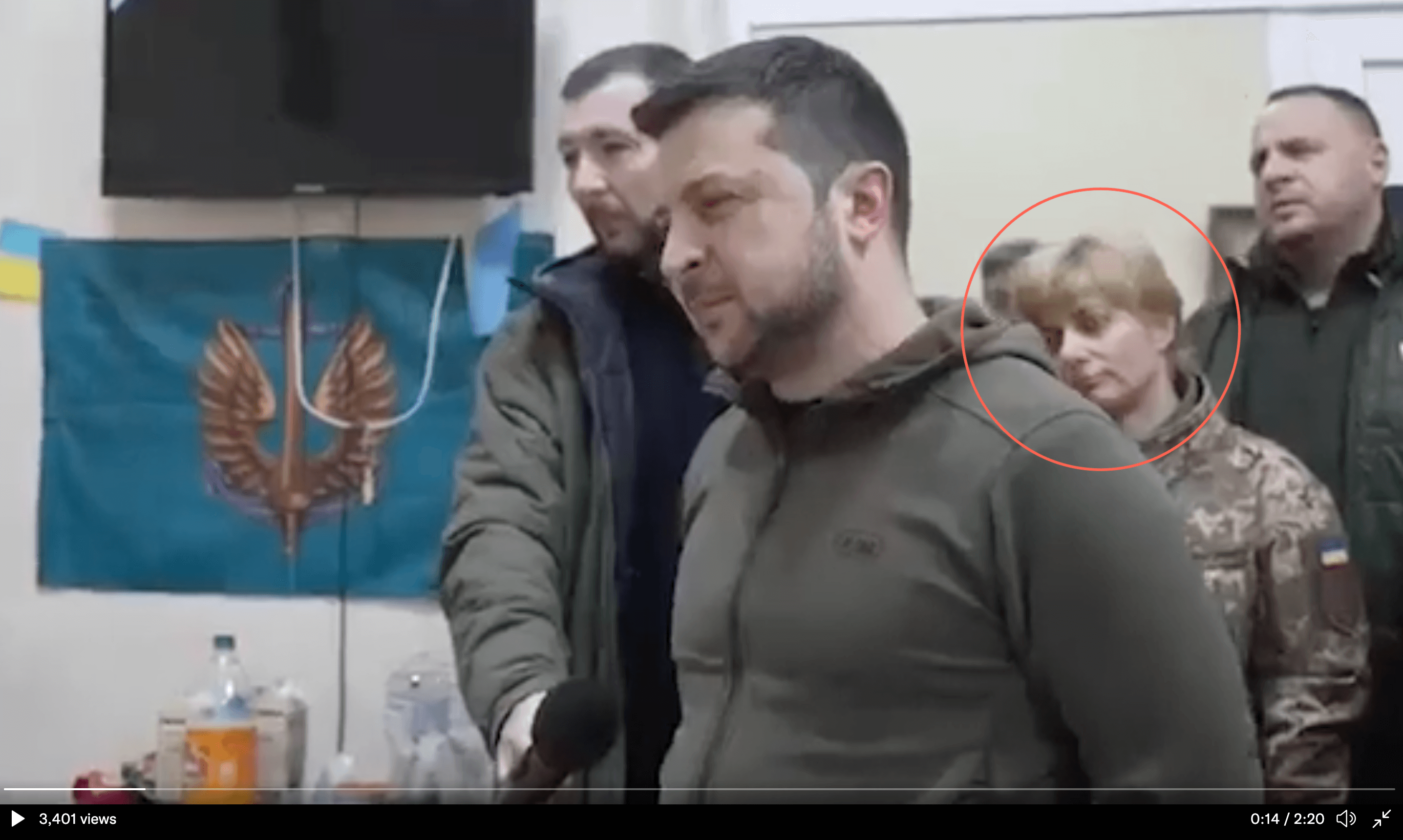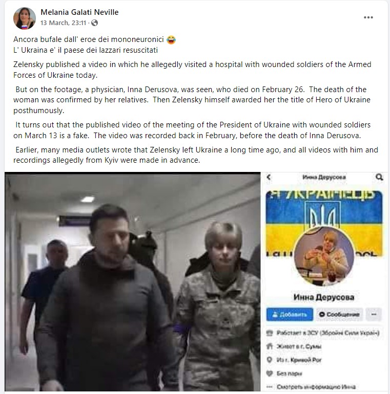 Əksər mənbələr iddia edir ki, Ukrayna mediası Zelenskinin Ukrayna paytaxtında olduğunu sübut etmək üçün onun yaralı əsgərlərlə görüş videosunu yayıblar. Lakin müxalif fikirlilər və Rusiya mediası, sosial medianın anti-Zelenski kəsimi prezidenti məsxərəyə qoyub, iddia ediblər ki, həmin kadrlarda Prezidenti müşaiət edən qadın İnna Derusovadır və adıçəkilən xanım 27 fevralda həlak olub. Yəni, kadrlar köhnədir, Zelenski Kievdə deyil.