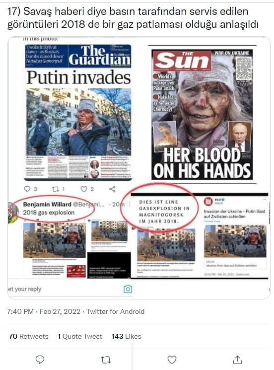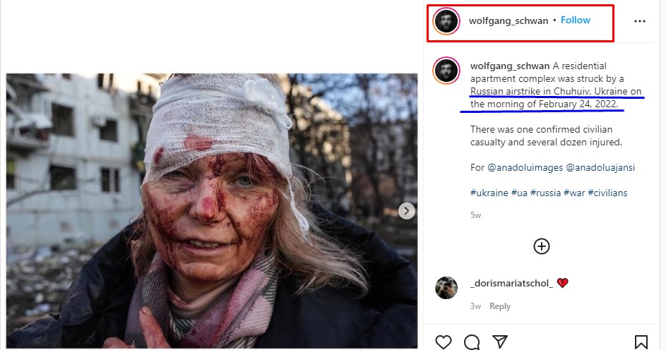 Araşdırma aparan mərkəzlərin bildirdiyinə görə, “əks foto axtarış metodu” ilə incələnmə zamanı fotonun yaxın tarixdə çəkildiyi bəlli olub. “Anadolu Ajansı”-nın foto arxivinə görə, bu foto Wolfgang Schwan tərəfindən 24 fevralda Ukraynanın Xarkov vilayətinin Çuguyev qəsəbəsində çəkilib.