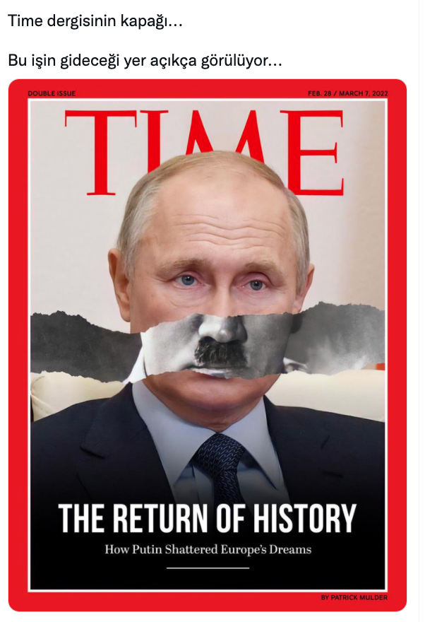 Putinin Hitlerə bənzədildiyi foto-kollaj isə ilk dəfə Patrick Mulder adlı Twitter istifadəçisinin paylaşımında rast gəlinib. Mulder tvitində “Time” jurnalı adına paylaşılan saxta fotonu necə düzəltdiyinə aydınlıq gətirib. (How I made the cover). Bu video paylaşımdan sonra istifadəçilər həmin fotoya daha diqqətlə baxıb, üz qabğı fotosunun aşağı sağ küncündə “Patrick Mulder” yazıldığını görüblər.