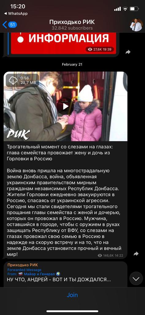 Bundan başqa, videonu 21 fevralda Qorlovka şəhərinin bələdiyyə başçısı İvan Prikxodko telegram kanalında “Yoldaşı və qızı təxliyyə edilən kişi” başlığı ilə paylaşıb.