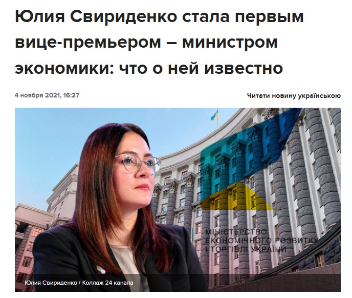Ukrayna Baş nazirin birinci müavini isə həm də iqtisadiyyat naziridir və onun özü də xanımdır- Yulia Sviridenko. Onun yoldaşı isə Sergey Derlemenko adlı iş adamdır.