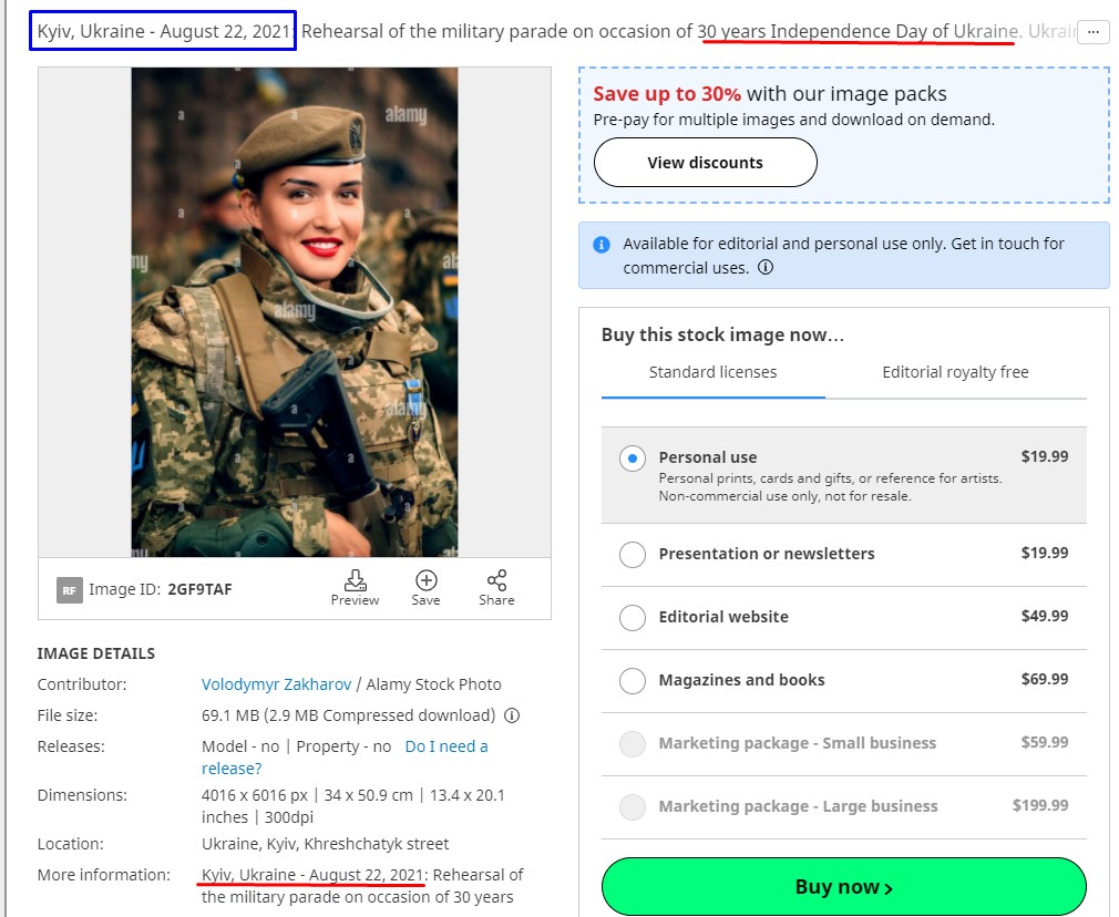 Aşkar olunan fotonun orijinalında yazılır: Kiyev, 22 Avqust, 2021, Ukrayna Müstəqilliyinin 30 ili münasibətilə hazırlanan hərbi paradın məşqi. “Khreshchatyk (məşhur Maydan-red.) prospektində gülümsəyən əsgəri uniformalı ukraynalı qadın”. Bu kadrların doğruluğunu youtube kanalında yayımlanan video vasitəsilə təsdiqləmək mümkündür.