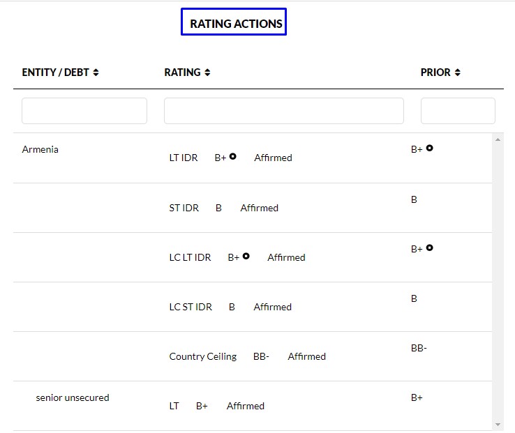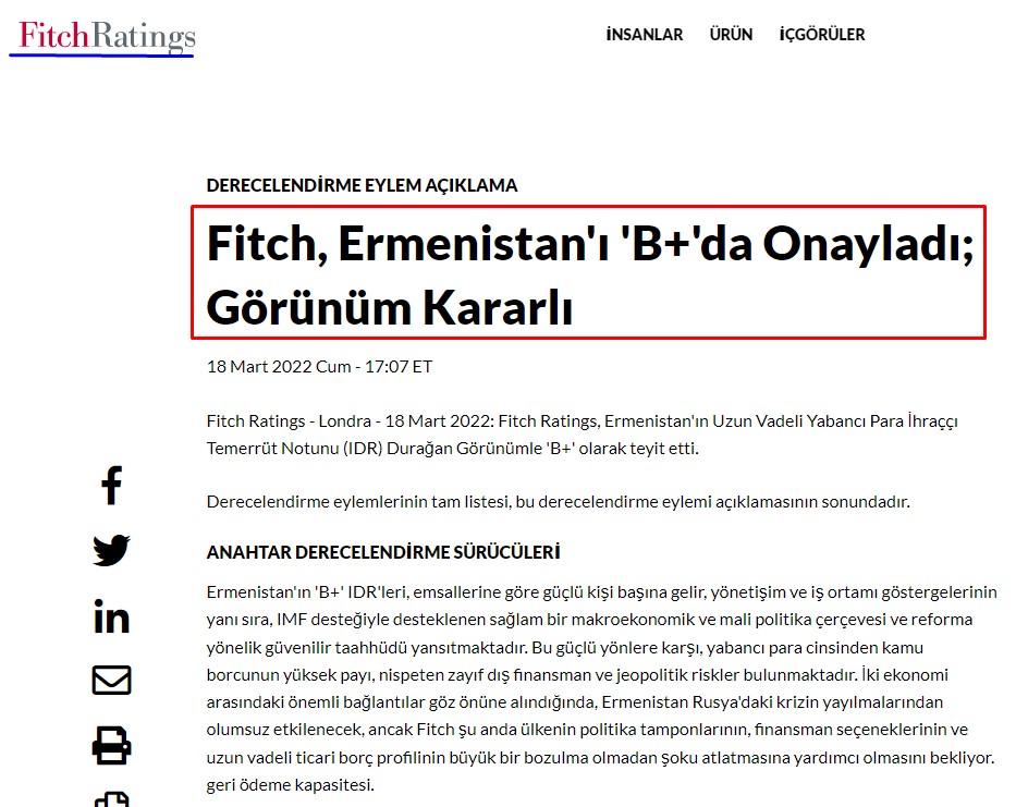 “Fitch Ratings” beynəlxalq reytinq agentliyi Ermənistan iqtisadiyyatının xarici valyuta uzunmüddətli reytinqini aşağ salaraq “B+” səviyyəsində təsdiqləyib. Buna səbəb ölkə iqtisadiyyatın böyük bir hissəsinin tamamilə Rusiyadan asılı olmasıdır. Ukrayna ilə müharibə nəticəsində RF-nın üzləşdiyi ağır iqtisadi sanksiyalar səbəbindən maliyyə şokları yaşaması iqtisadi inhisarında olan ölkələrin sırasında ilk yerdə dayanan Ermənistana da sirayət edir. Rusiyanın tədiyyə sistemindəki risklərdən ən çox təsirlənən də bu ölkədir. Çünki Ermənistan iqtisadiyyatı dolayısı ilə suveren deyil və özünü dayanıqlı maliyyə buferləri yoxdur. (Mənbə: fitchratings)