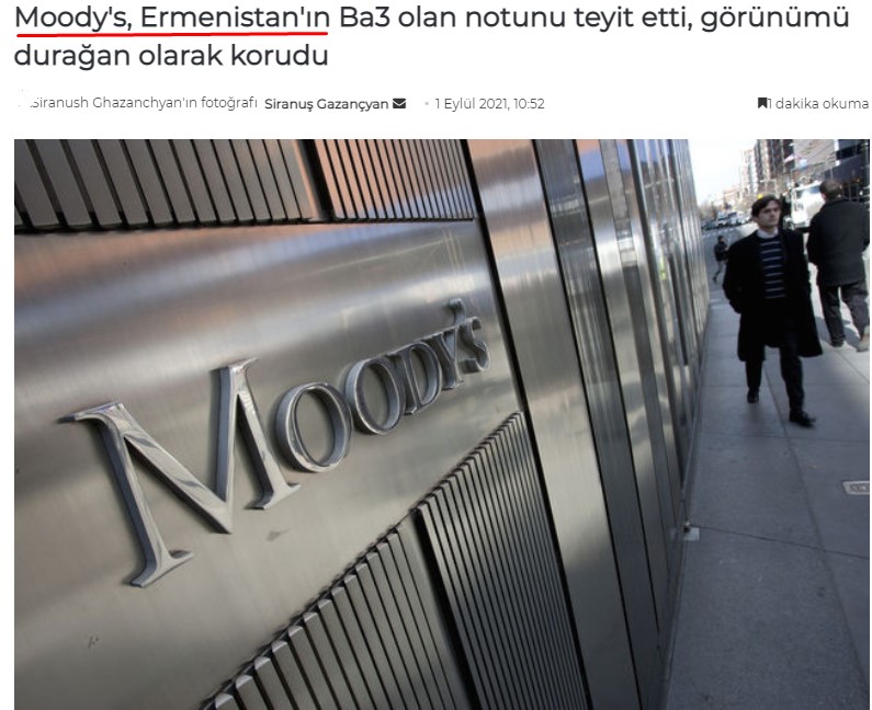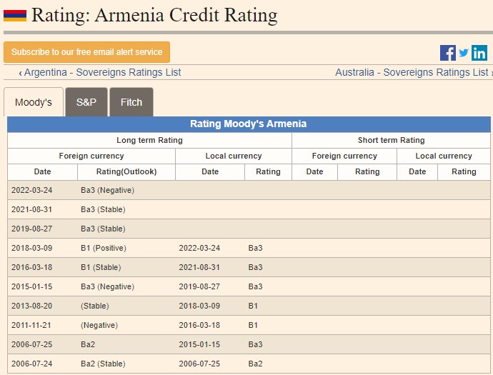 Agentliyin analitik qrupunun rəyindən belə qənaətə gəlmək mümkündür ki, Ermənistanın makroiqtisadi sabitliyi Beynəlxalq Valyuta Fondunun (BVF) maliyyə-borc dəstəyinə bağlıdır, Fond əlini geri çəkdiyi halda iqtisadi sabitlik dərhal pozula bilər. Həmçinin, xarici valyutada dövlət borcunun payının yüksək olması, zəif xarici maliyyə sisteminə çıxış və geosiyasi risklərin artması bu ölkəni defolt təhdidləri ilə üz-üzə qoyur.