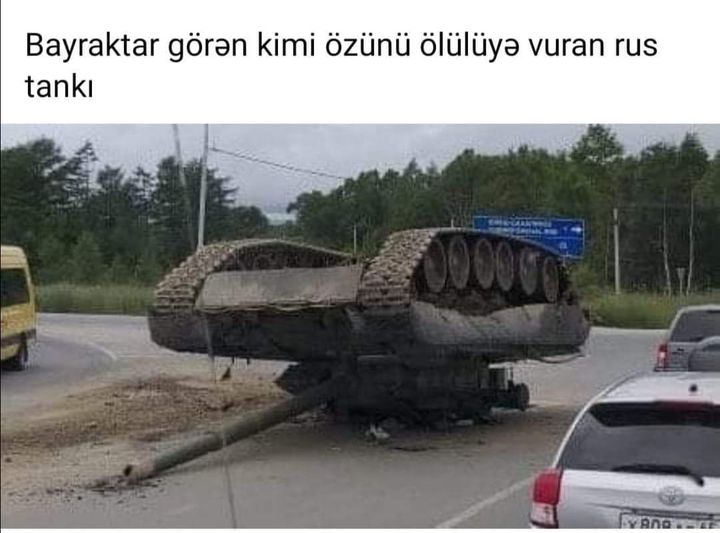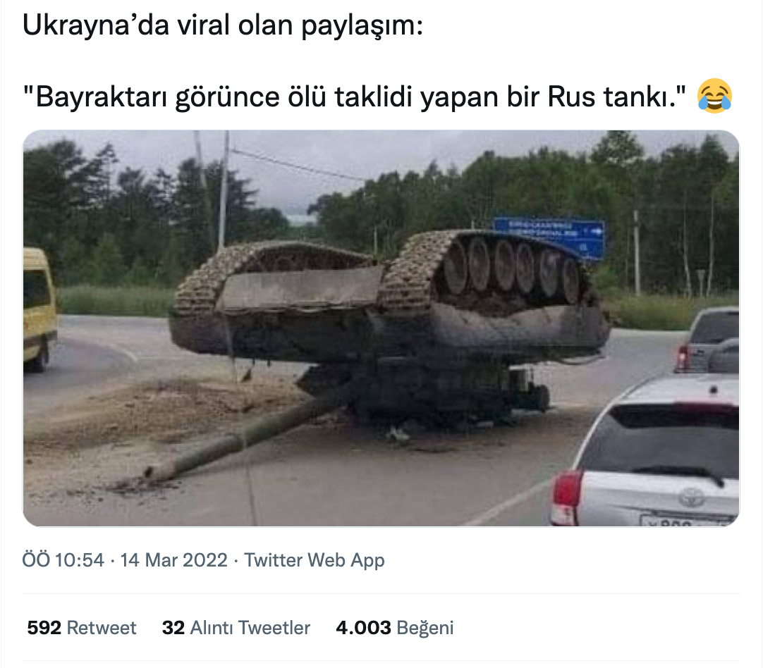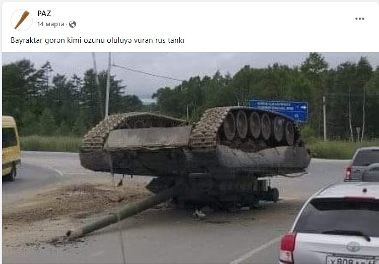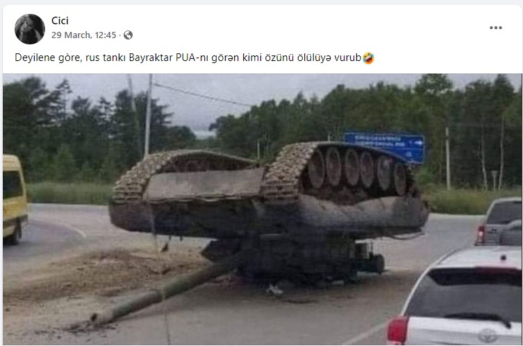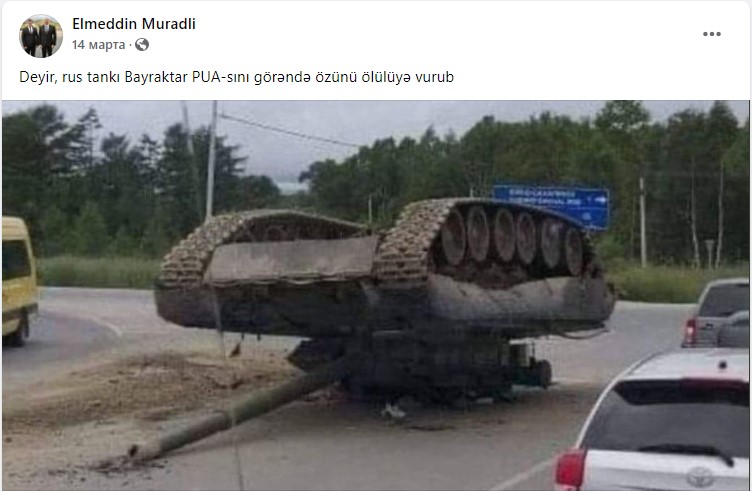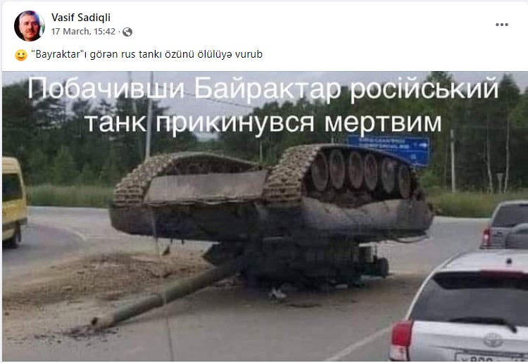 Rusiya-Ukrayna müharibəsində ən çox paylaşılan yalan xəbərlərdən biri də bu foto haqdadır. Türkiyə və Azərbaycan sosial media istifadəçilərinin fəxrlə yaydıqları “Bayraktarı görüb özünü ölülüyə vuran rus tankı” şərhini başa düşmək olar.