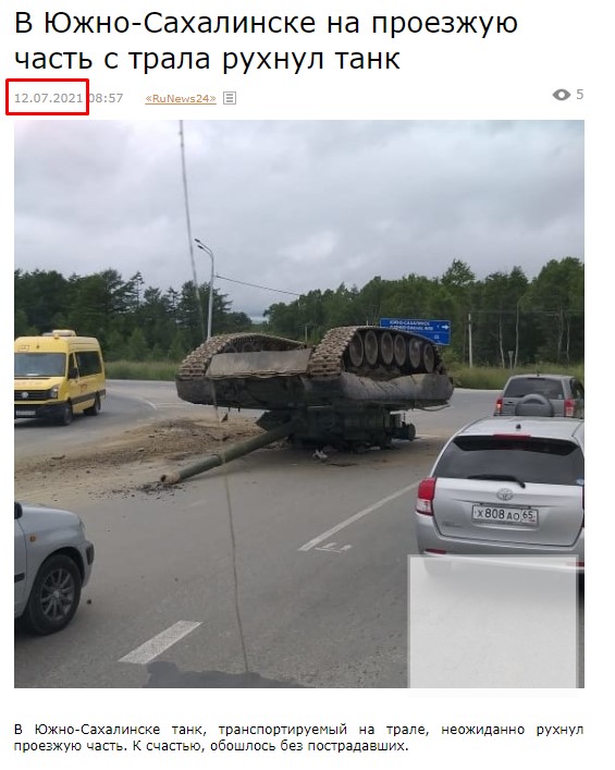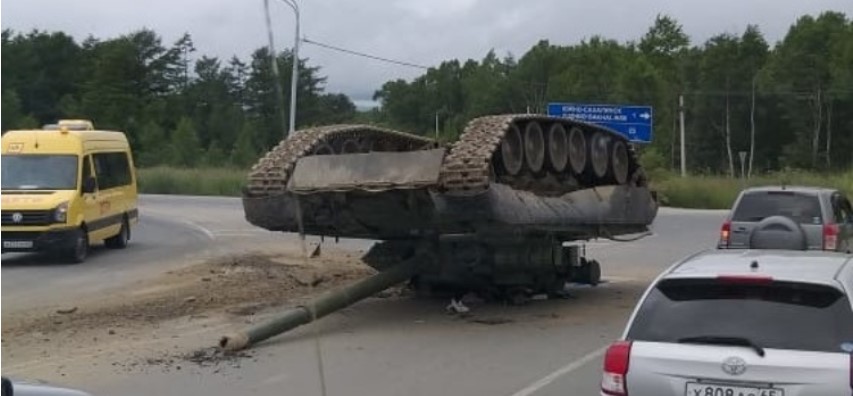 Bu hadisə 12 iyul 2021-ci ildə Rusiyanın Saxalin şəhərində baş verib. İstinad edilən mənbədə bildirilir ki, bu hadisə böyük həcmli texnikaların daşınması üçün nəzərdə tutulmuş evakuatorda (tral) aparılarkən təhlükəsizlik texnikasına riayət edilməməsi üzündən tank aşmış, arxası üstə yola düşmüşdür. Məlumatda o da bildirilir ki, nəticədə böyük tıxac yaransa da, qəzada xəsarət alan olmayıb.