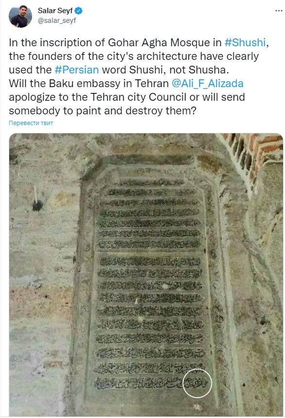 İndi ardıcıllıqla iranlı və erməni jurnalistlərin Şuşanın “Şuşi” kimi qondarma adla çağırılması üçün gətirdikləri arqumentləri araşdıraq. Salar Seyfəddini Şuşadakı Gövhər Ağa məscidindəki bu kitabəni paylaşır və işarələdiyi yerdə “Şuşi” yazıldığını qeyd edir.