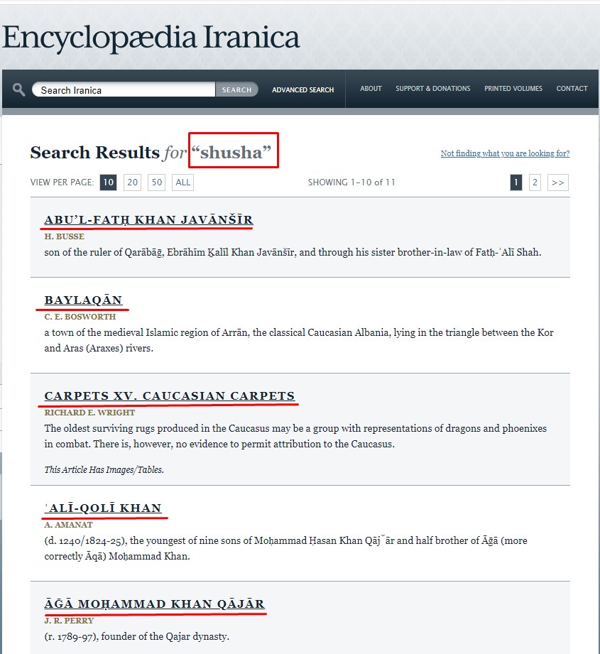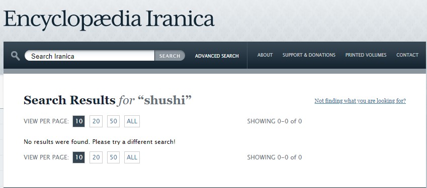 Bundan başqa, nüfuzlu “İranika Ensiklopediyası” var. Həmin saytda axtarış bölməsində “Şuşi” yazdıqda 0 nəticə alınırsa,