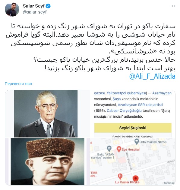İranlı jurnalist kimi təqdim olunan Salar Seyfəddini indiyə Azərbaycan əlehinə bir neçə provakativ tvit yazıb.