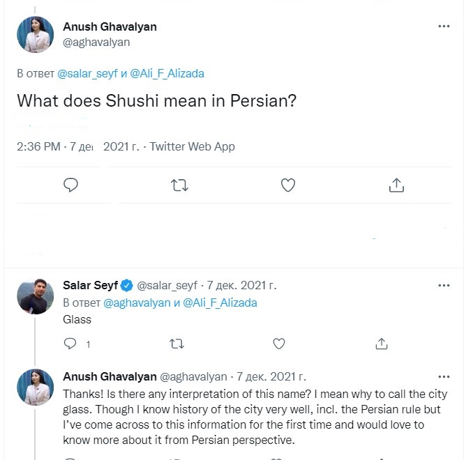 Bu yazışmalarda Xankəndində yaşayan, sepratçı jurnalist Anuş Gavalyanın Salar Seyfəddiniyə “Şuşa” fars dilində nə deməkdir?” mövzuya nabələd sualı həm erməni, həm də fars mənbələrini ciddi məyus edir. İranlı jurnalist yazır: “Şuşa- şüşə deməkdir”.