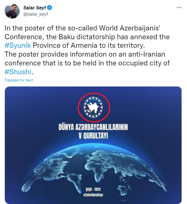 Tvitdə qeyd olunur ki, Dünya Azərbaycanlılarının 5-ci qurultayının bu posterində Ermənistanın Syunik bölgəsinin işğal olunduğu göstərilir. Bu poster anti-İran qurultayının işğal olunmuş Şuşi şəhərində keçiriləcəyi haqda informasiya verir.