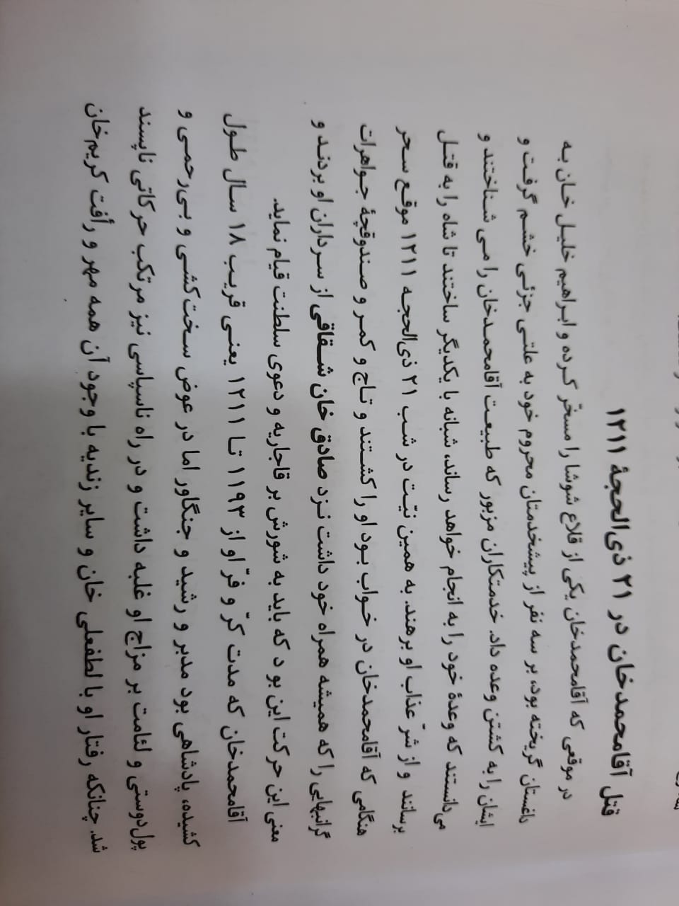 “Ağa Məhəmməd Xan Şuşanın qalalarından birini ələ keçirən və İbrahimxəlil Xan Dağıstana çəkilən zaman elə də əhəmiyyətli olmayan səbəblərdən xidmətçilərindən üç nəfərə əsəbiləşdi və onları öldürəcəyini dedi...” (Ağaməhəmməd xanın 21 zilhiccə 1211-ci ildə qətli, səhifə 953).