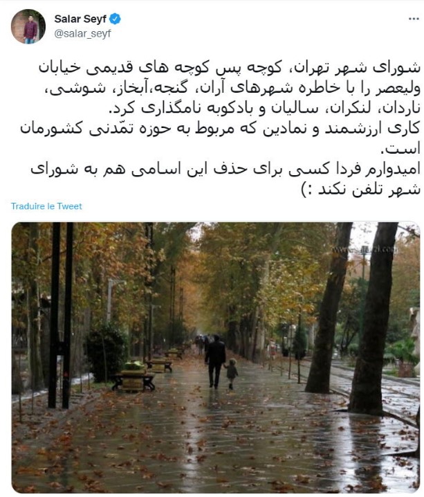 Jurnalist Salar Seyfəddini bununla bağlı Twitterdəki bloqunda yazıb: "Küçələrin adlarının belə dəyişdirilməsi vacibdir, çünki o şəhərlərin və məkanların İran mədəniyyətinə aid olduğunu göstərir. Ümid edirəm ki, yaxın günlərdə Şəhər Şurasına təzyiq göstərərək qərarı dəyişməzlər".