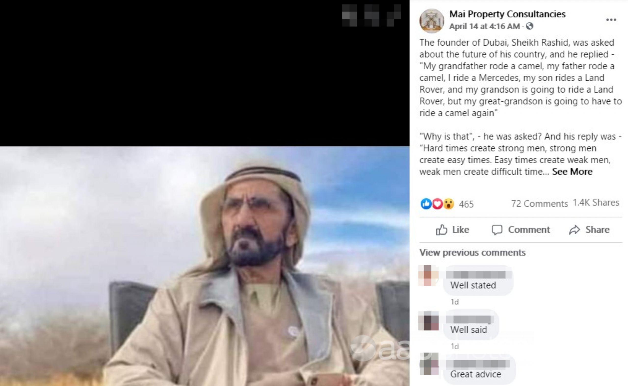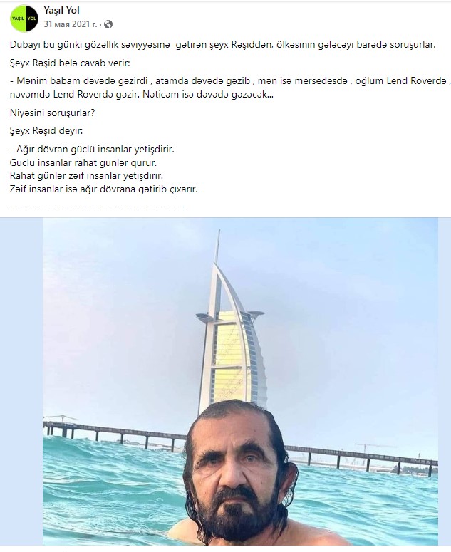 Paylaşılan statusda deyilir: Şeyxdən dövlətin gələcəyini necə gördüyünü və inkişaf tempinin saxlanması üçün nə etməli, soruşduqda, belə cavab vermişdir: "Mənim babam dəvədə gəzərdi, atam da bu vasitədən istifadə etmişdir. Mən və oğlanlarım "Mersedes"də, nəvələrim "Land Rover"-də hərəkət edirlər. Nəticələrim isə yenidən dəvələrdə gəzəcəklər".