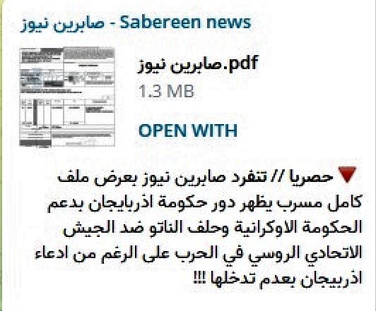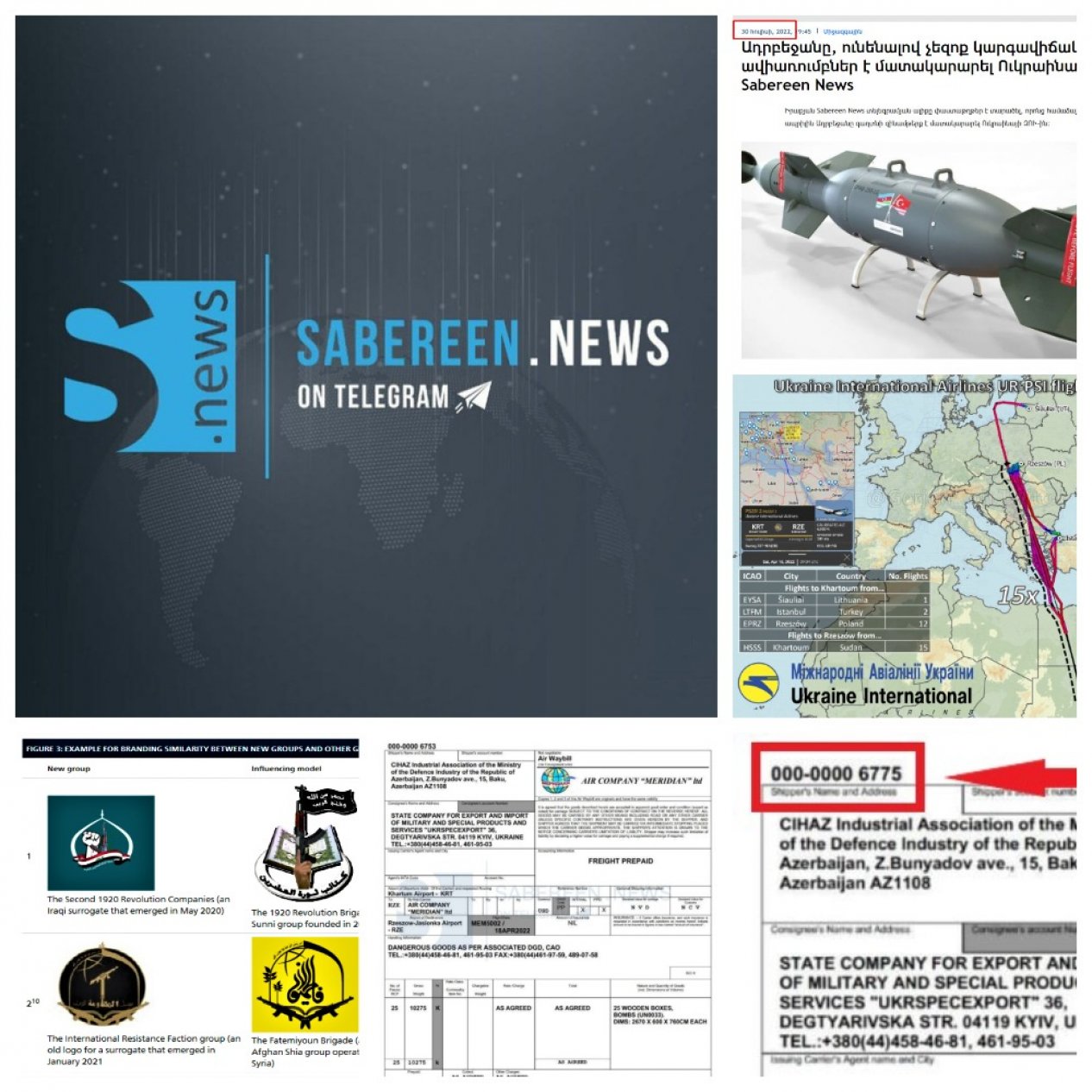 Bu paylaşımdan 10 saat sonra həmin məlumatları əks etdirən link “Sabereen News”-un tvitter səhifəsində paylaşılıb. Beləliklə, mediaya Azərbaycan əlehinə yazmaq üçün yeni mövzu və unikal platforma verilib. İlk olaraq Rusiyadan yayımlanan “wingsofwar” (Müharibənin qanadları) teleqram kanalı bu kampaniyanın öncülü olub. Həmin kanalın məlumatında deyilir: “Azərbaycan neytral statusda olmasına baxmayaraq Ukraynaya aviamərmilər göndərib. İraqın “Sabereen News” teleqram kanalının yaydığı sənədlərə görə Azərbaycan 2022-ci ilin aprel ayında ukraynalı hərbçilərə gizli şəkildə silah və sursat verib. Sənədlərə görə, bu əməliyyat Azərbaycan Müdafiə Sənayesi Nazirliyinin Cihaz Sənaye Assosiyasiyası ilə Ukraynanın “Ukrspecexport” Dövlət Konserninə arasında baş tutub. Sudanın paytaxtı Xartumdan Polşanın məşhur hərbi aerodromu Rjeşuv şəhərinə daşımanı Ukraynanın "Meridian" avia-yükdaşıma şirkəti MEM5002 reysi ilə 16, 18, 20, 22, 24, 26, 28 və 30 apreldə həyata keçirib”.