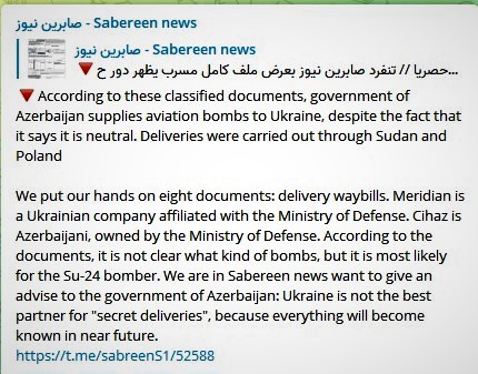Azərbaycandan Ukraynaya aviabombaların, lazerli avia-zərbə raketlərinin göndərilməsi haqqında sensassiyalı məlumat yayılıb. İraqdan yayımlandığı deyilən “Sabereen News” teleqram kanalı 8 təyyarə reysi orderinin fotolarını və belə bir şərhlə paylaşıb: “Eksklüziv. Azərbaycanın neytral qalacağını deməsinə baxmayarq, müharibədə Rusiya Federasiyası ordusuna qarşı Ukrayna hökuməti və NATO-ya dəstək verməkdə Azərbaycan hökumətinin rolunu göstərən sızmış faylı təqdim edirik. Bu yöndə “Sabereen News” unikaldır”. Həmin paylaşımdan 1 dəqiqə sonra isə növbəti paylaşım olub: “Bu məxfi sənədlərə görə, Azərbaycan hökuməti neytral olduğunu bildirməsinə baxmayaraq, Ukraynaya aviasiya bombaları verir. Çatdırılmalar Sudan və Polşa vasitəsilə həyata keçirilib. Əllərimizin altında səkkiz sənəd var: daşıma sənədləri. “Meridian” Ukrayna Müdafiə Nazirliyinə bağlı şirkətidir, “Cihaz” isə Azərbaycanın Müdafiə Nazirliyinə məxsusdur. Sənədlərə əsasən, hansı növ bombalar olduğu bəlli olmasa da, böyük ehtimalla bu, Su-24 (?-red.) bombardmançısına aiddir. Biz “Sabereen” xəbərçisi olaraq Azərbaycan hökumətinə bir məsləhət vermək istəyirik: Ukrayna “gizli çatdırılmalar” üçün ən yaxşı tərəfdaş deyil, çünki yaxın gələcəkdə hər şey məlum olacaq”.