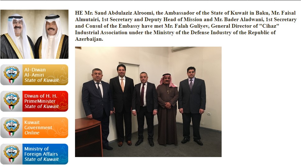 İnanılmazdır, amma faktdır. Həmin linkdə bunlar yazılıb: “Küveyt Dövlətinin Bakıdakı səfiri Cənab Səud Əbdüləziz Əlrumi, 1-ci katib və missiya rəhbərinin müavini cənab Faisal Almutairi və Səfirliyin 1-ci katibi və konsulu Bader Aladwani Azərbaycan Respublikası Müdafiə Sənayesi Nazirliyi yanında “Cihaz” İstehsalat Birliyinin baş direktoru cənab Fəlah Quliyev ilə görüşüb”.