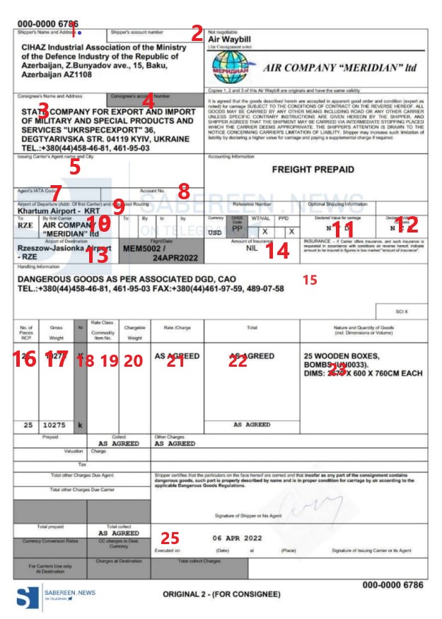 2. “Sabereen News”-da, həmin informasiyadan yararlanan “Müharibənin qanadları” da silah daşınması əməliyyatlarının Ukraynanın “Meridian” avia-daşımaçılıq şirkəti tərəfindən həyata keçirildiyini qeyd edirlər. Hətta link də verilib. Doğrudan da “Meridian” Ukraynada daşımaçılıq, kargo xidmətləri göstərən yüzlərlə şirkətlərdən biridir. Şirkət haqqında çox geniş yazmağa lüzum yoxdur, qeyd olunan linkə daxil olub, əlavə məlumat almaq mümkündür. Biz hər iki teleqram kanalının yaydıqları sənədlərin fotosuna qayıdaq.