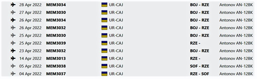 Bu skrində təkcə aprel ayında həyata keçirilən daşıma marşrutları göstərilib. Diqqət yetirdiksə İraq teleqram kanalının sızdırdığı məlumatlarda qeyd olunan “MEM5002” koduna bir dəfə də rast gəlinmir. Düzdür, apreldə uçuşların çoxu Polşanın Rjeşuv (RZE) aerodormuna olub. Amma heç birinin başlanğıc nöqtəsi Xartum (Sudan) deyil. Başlanğıc nöqtə Bolqarıstanın Burgev (BOJ) və Sofiya(SOF) şəhərləridir. Belə çıxır ki, ya yayılan sənədlər saxtadır, ya da daşımaları “Meridian” şirkəti həyata keçirməyib. Qeyd edək ki, cədvəldə gördüyünüz “UR-CAJ” uçuşu həyata keçirən təyyarə növüdür.