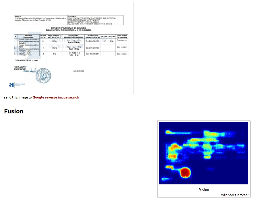 Məlumatda yüklərin “Precision Guided Air Bomb” və “Precision Guided Air Bomb INERT” təsnifatı ilə qeyd olunduğu bildirilir. Yekunda qeyd olunur: “Beləliklə, Azərbaycan münaqişə tərəflərina münasibətdə neytral qalacağını bildirməsinə baxmayaraq Ukrayna Silahlı Qüvvələrinin silahlanmasında birbaşa iştirak edib. İki vacib sual yaranır: Rusiya və Luqansk Demokratik Xalq Respublikasına qarşı belə mərmilərdən nə qədər istifadə olunub və Azərbaycana bu çirkli oyunda iştirak nəyə lazım idi? Müəmmalı gəlirlər üçünmü?”.