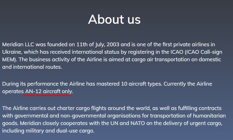Onu da qeyd edək ki, şirkətin saytında “Meridian” avia-daşımaçılıq şirkətinin məsul olduğu yükləri adətən, (uçuşların təxminən 90%-i) “Antonov” tipli (AN-12) təyyarələrlə həyata keçirirlər. Amma yayılan məlumatlarda Merdian şirkətinin qeyd edilən “təhlükəli yükləri” "Boing" tipli təyyarələrlə daşıdığı bildirilirdi.