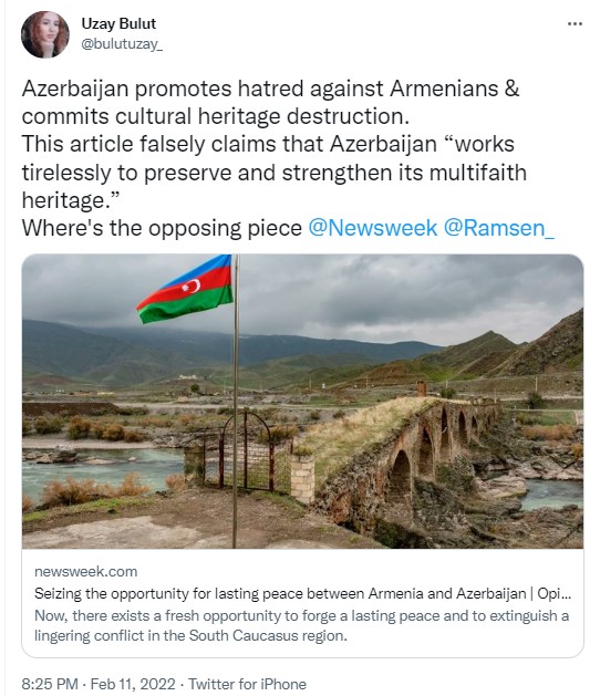 Ermənilərin müharibə ilə heç bir əlaqəsi olmayan Gəncə, Tərtər və Bərdə kimi yaşayış məntəqələrini vurmasına əhəmiyyət belə verməyən jurnalist Azərbaycanın Vaşinqtondakı keçmiş səfiri Elin Süleymanovun “Newsweek” jurnalında dərc olunan “Ermənistan və Azərbaycan arasında əbədi sülhün təmin olunması fürsətini əldə etmək” sərlövhəli məqaləsini öz tvitter hesabında paylaşaraq “Azərbaycan dəyərlərə və inanclara hörmət mühitini özünəməxsus şəkildə inkar edərək, ermənilərə qarşı nifrət yaradır və mədəni irsi məhv edir. Bu məqalədə yalandan iddia edilir ki, Azərbaycan “çoxkonfessiyalı irsini qorumaq və gücləndirmək üçün yorulmadan çalışıb”. – şəklində şərh yazır.