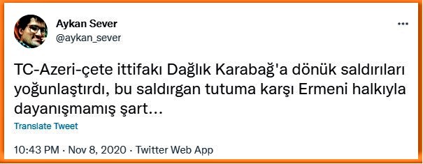 İllərdir Belqradda yaşayan jurnalist və özünü “qardaşlıq carçısı” kimi göstərməyə çalışan PKK yaraqlısı  44 günlük müharibə zamanı tvitlərinin birində yazırdı: "Türkiyə-Azərbaycan banda ittifaqı Dağlıq Qarabağa hücumları gücləndirib. Bu təcavüzkar münasibətə qarşı erməni xalqı ilə həmrəy olmalıyıq..."