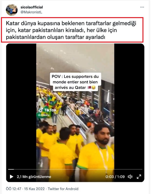 İddiaya dəstək olaraq təqdim olunan videoda müxtəlif ölkələrin formasını geyinən azarkeşlər var. Videodakı insanların əksəriyyətinin kişilər olduğunu da söyləmək olar. 15 noyabr 2022-ci ildə “Twitter”də paylaşılan videoya 2 milyon dəfədən çox baxılıb.